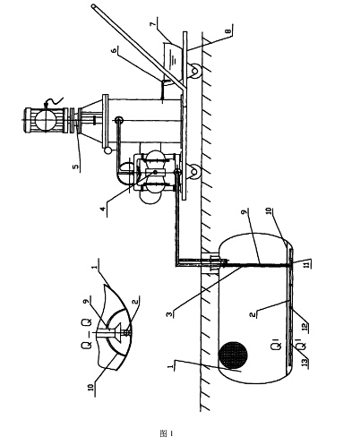 所述的喷油横管2每间隔300-500毫米的位置设置有一喷油口13(本附图给出每380毫米设置一喷油口或一对喷油口)。第一位置的喷油口13设置在喷油横管2的底部,相继第二位置的喷油口13设置喷油横管2的侧壁上,为两个对称的喷油口13,如此交错布置,喷油口直径选为Φ20毫米。在喷射横管2三个不同位置焊有卡箍12,卡箍12下支脚座落在防爆储罐1的罐底上;交错设计喷油口13的位置,其目的在于增强清污隧道10内清洁油搅动油泥的冲力并形成油、污混合流,同时又吸油管9受到气动隔膜泵4的吸力,迫使清污隧道10内油、污混合流的流动。