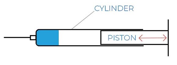 向后拉注射器的活塞会产生吸力,将液体拉入气缸,同时向前推动活塞将液体通过注射器的推头排出(图 1)。