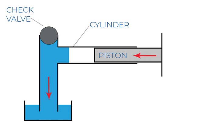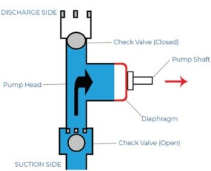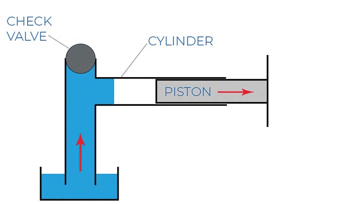 以同样的方式,泵中的隔膜向泵体内和向外移动,与止回阀一起工作以吸入和排出泵中的流体。下面的图 2 显示,如果没有止回阀,当活塞向外移动时,空气会简单地流入气缸,从而阻止任何吸入。