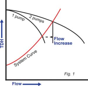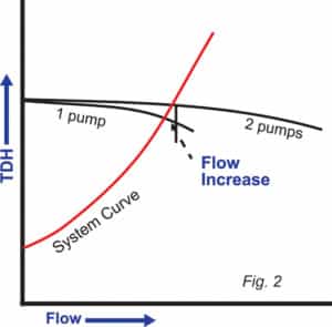 例如,假设有一组固定喷嘴,其中系统阻力是纯摩擦的,并且仅作为流量变化的结果而变化。当引入第二个泵时,系统中的阻力会随着流量的增加而增加。