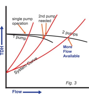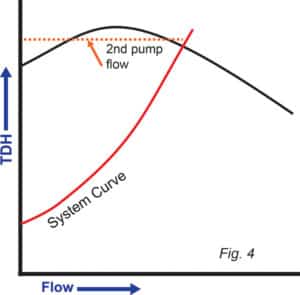 在图 4 中,系统曲线和 TDH 曲线在大于关闭 TDH 值的 TDH 和低于曲线的最大 TDH 的 TDH 处相交。当第二个泵启动时,流量将仅增加到 TDH 与系统压力匹配的第一个点。