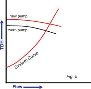 当一个泵磨损时,可能会出现类似的情况。这在图 5 中有所提及。随着泵的磨损,在任何给定流速下产生的 TDH 量都会减少。如果新泵与系统曲线的交点并联在磨损泵的关闭TDH之上,它将迫使磨损泵进入关闭状态。