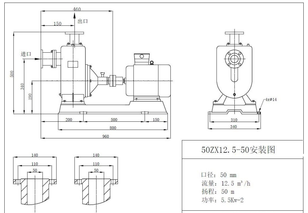 50ZX12.5-50自吸泵型号前面的50代表进出口口径为50mm、ZX表示为自吸式离心泵、12.5代表额定流量12.5立方米每小时、50表示泵的额定扬程50米、自吸高度为5米,配用5.5KW功率电机。如果用户要求吸程较高,还可以加装真空辅装置,做成吸程可达9米的高吸程自吸泵。应当注意的是,因为自吸泵参数是使用清水测试而得出的,但在使用中会因为输送介质的粘度及管道损耗等原因,导致实际使用中流量、压力参数减小。所以在选型的时候应当留有一些余量,尤其在工况要求扬程必须达到50米时,建议选大一个自吸泵型号,选择50ZX15-60自吸离心泵使用。
