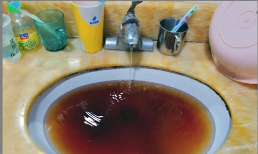 随后,记者来到鲍先生家中,在卫生间的洗脸池中,有一盆黑褐色像酱油一样的水。“这还是中午接的水,放在这里沉淀了这么长时间,颜色都没变。”鲍先生说,由于前天上夜班,他休息到昨天中午才起床。鲍先生本准备洗漱做饭,一开水龙头却吓了一跳,流出来的水又黄又浑浊,他只能用家里剩下的一点凉开水刷牙。“从发现自来水变色到现在几个小时了,水还是脏的,也不知道是啥原因。”鲍先生当着记者的面打开水龙头,自来水水流很小,而且依然是黑褐色的。