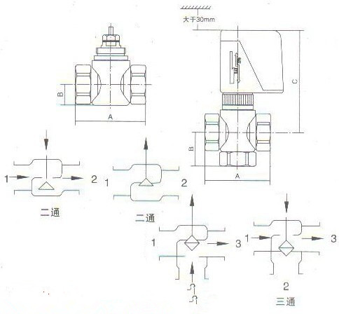 三、VA7010系列风机盘管电动阀结构、尺寸及安装示意图: